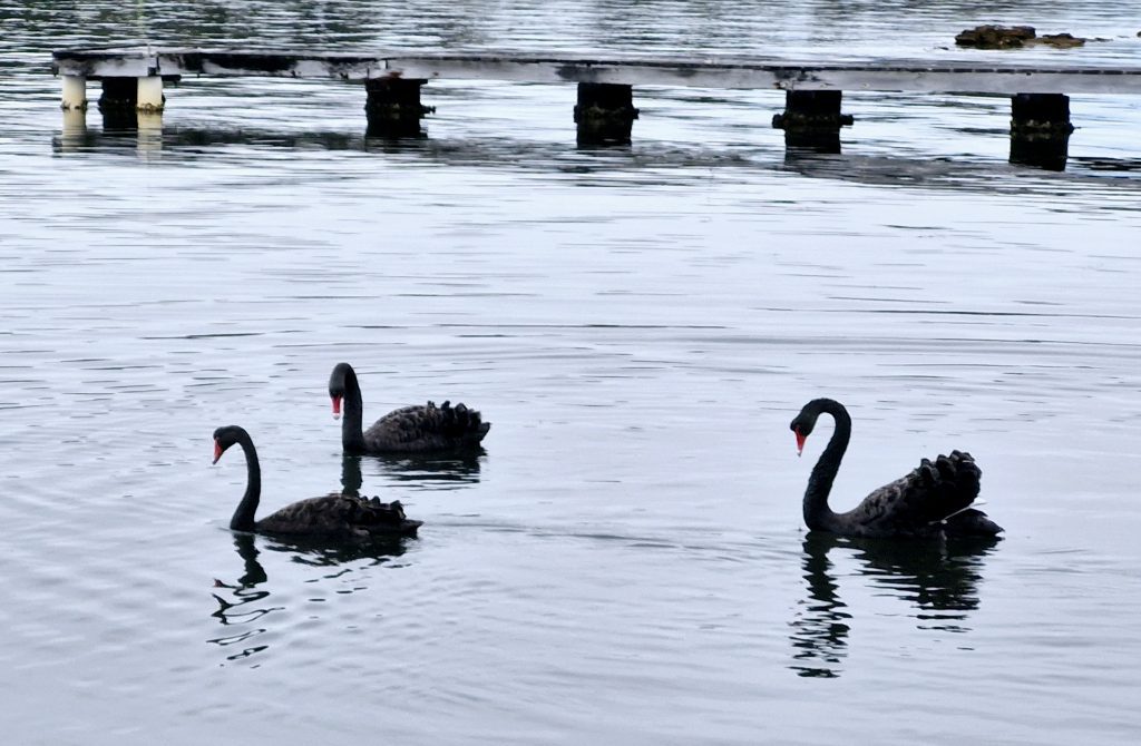 Here for the last few weeks, we have been lucky to have a bank of beautiful black swans visiting us every morning.